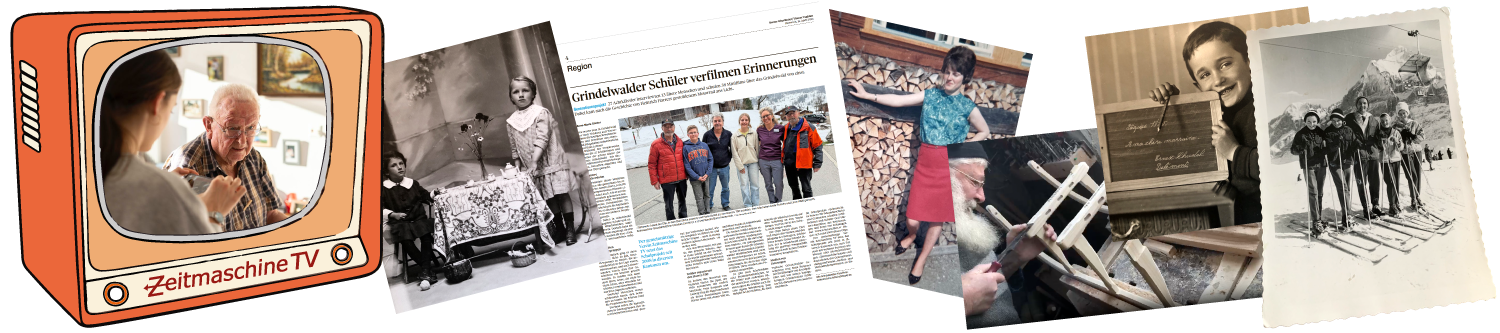 Im interkantonalen Schulprojekt «Zeitmaschine bauen» befragen SchülerInnen ZeitzeugeInnen zu Jugenderinnerungen. Aus den Erzählungen und Privatfotos schaffen sie Kurzfilme. Die Projektwoche wird vom gemeinnützigen Verein Zeitmaschine TV getragen und an Sekundarschulen sowie Gymnasien umgesetzt. Anfang Februar 2026 befragten die AchtklässlerInnen von Grindelwald im Berner Oberland die BewohnerInnen des Altersheims und weitere lokalen ZeitzeugInnen. Hier finden sie die dabei entstandenen Public History Clips.